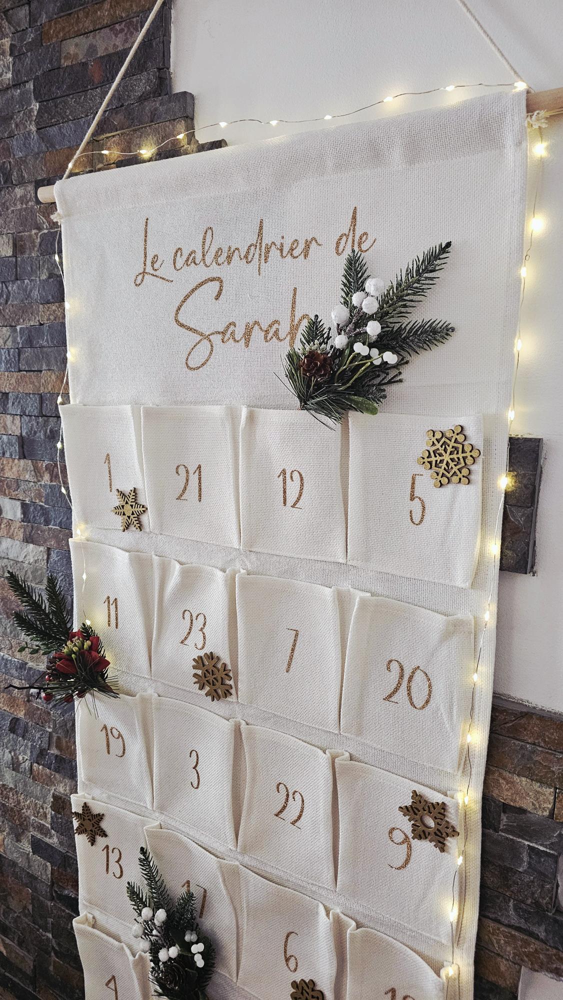 Le texte et les chiffres sont en flex thermocollant doré pailleté, je vous propose également de choisir 4 phrases au choix. Vous pouvez rajouter le prénom de l’enfant si vous le souhaitez . Le calendrier mesure 1m10 * 45 cm et se suspend grâce à une petite cordelette maintenu par un bâton de bois. Les poches mesurent 10*14 cm . le calendrier sera également décoré par des petits flocons de bois.