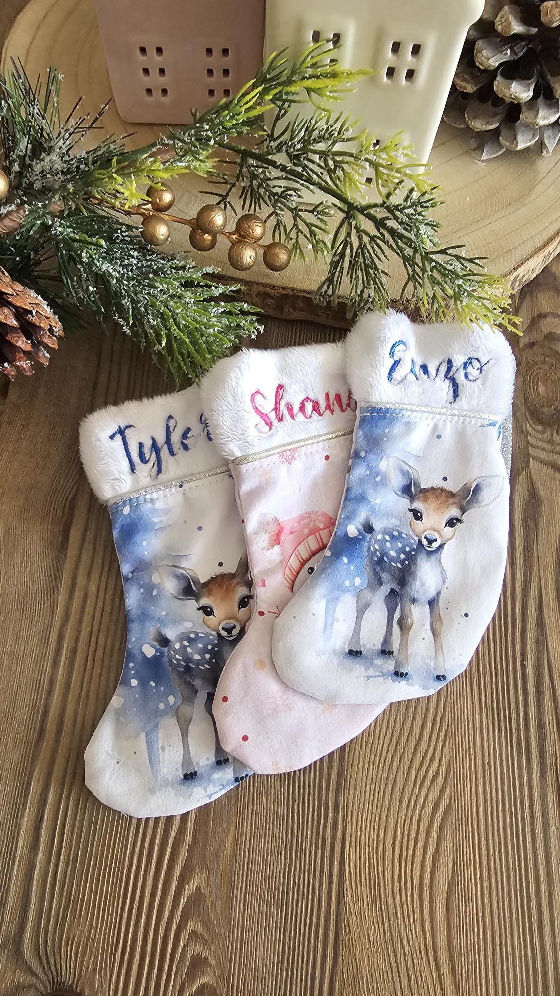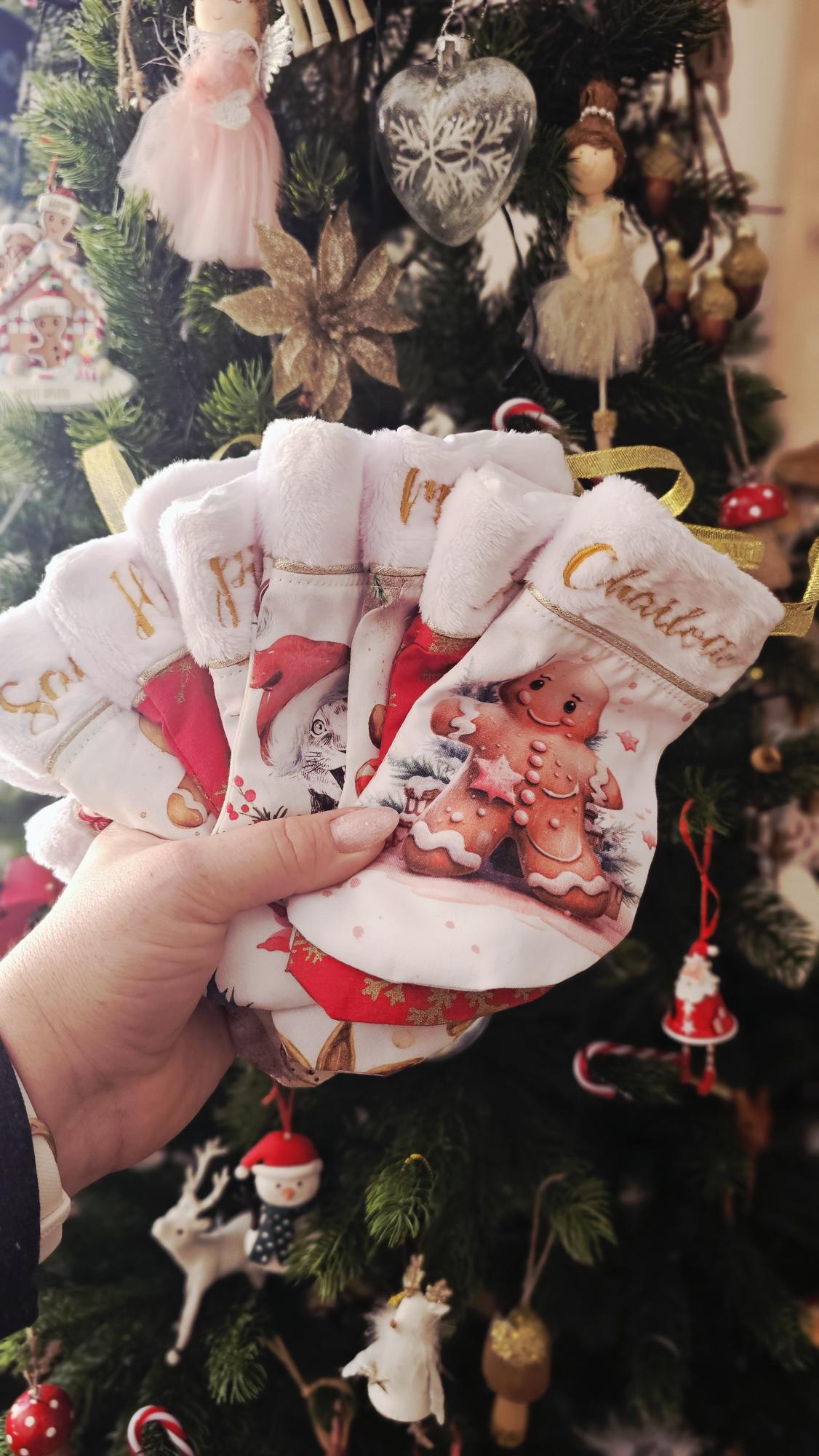 Les mignonettes mesurent environs 15 cm de hauteur et 8 cm au plus large. Elles sont en coton imprimé et en minky lisse sur la parti haute. Elles sont entièrement doublé et ont un petit ruban pour accrocher.